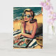Ich vermisse dich, hoffe, du hast einen tollen Sommer! Retro Pop Kunstfrau in Sonnenbrille am Strand liest eine Mode-Zeitschrift.