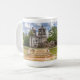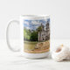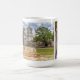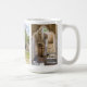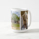 Einzigartiges Design der Tasse mit Mission Concepción in San Antonio, Texas. Ein Foto des Eingangszeichens mit den Glockentürmen und ein Detail eines Kreuzes mit Treppen.