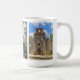 Einzigartiges Design der Tasse mit Mission Espada in San Antonio, Texas. Ein Foto der Intricate Details über das schmiedeeiserne Kreuz-Design mit weichen Fokusbäumen und subtilen blauen Himmel dahinter.