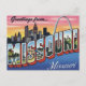 Feiern Sie den Show-Me-State mit dieser auffallenden Retro-Postkarte "Greetings from Missouri". Dieses klassische Design mit großen Buchstaben zeigt prominent die Skyline von St. Louis und den ikonischen Gateway Arch und fängt den Geist des Mittleren Westens in Sachen Reisen und Erkundung ein. Der vintage Kunststil und die lebendigen Farben machen diese Postkarte zu einem perfekten Erinnerungsstück für Einwohner von Missouri, Touristen, Geschichtsinteressierte, Souvenirsammler oder jeden, der klassische Americana und Stolz auf US-Bundesstaaten schätzt. Verschenken Sie ein einzigartiges Stück Nostalgie oder zeigen Sie es als kleine gerahmte Kunst.
