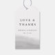Bringen Sie diese süßen Geschenkanhänger an Ihre Gastgeschenke Hochzeiten, um Ihre Liebe und Ihren Dank auszudrücken. Diese schicken Tags wurden speziell für die Abstimmung mit unserer Mist Hochzeitskollektion entworfen und verfügen über einen grauen Aquarell-Waschhintergrund mit "Liebe und Dank", Ihren Namen und Ihr Hochzeitstermin in schwarzem Holzkohle. Alle Textfelder sind für die ultimative Anpassung bearbeitbar!