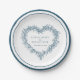 Mistletoe Herzkranz zeichnend dunkelblaue und weiße Winterhochzeitpapierteller. Fügen Sie Ihren eigenen Paarnamen und Hochzeitsdatum in einem klassischen dunkelblau auf knusprig weiß. Andere Farben und passende Hochzeitsartikel sind erhältlich. © Original zeichn und Design von Sarah Trett für www.mylittleedenweddings.com auf Zazzle.