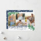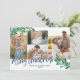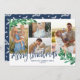 Weihnachtskarte im Foto mit einer Foto-Collage mit vier Fotos und hübschen Mistelzweigen in Grün und Blassblau. Frohe Weihnachten ist in einem nachtsblauen, charmanten Kalligraphieskript geschrieben. Fügen Sie Ihren Familiennamen und das Jahr in eleganten blauen Schriftart hinzu. Der Rücken weist ein passendes Misletonmuster in Weiß- und Marineblau auf.