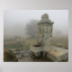 Ein Steinbrunnen steht in einer nebeligen Landschaft, in der Nähe gibt es einen einsamen Baum und ein kleines Wasserbecken.
