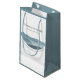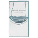 Hochzeitsgeschenktaschen mit Gebirgsdesign. Das dunkelblaue Gebirgsbild in einem Halbkreis wird auf einer Seite von Taschen gedruckt, die in kleinen, mittleren oder großen Größen (die Wein-/Flaschengröße funktioniert nicht) geliefert werden. Die große Tasche ist ganz weiß. Geben Sie die Namen der Braut und des Bräutigams, das Hochzeitstag und das Begrüßungsdatum des Sprichworts ein. Die Taschenfront ist weiß mit einem halbkreisförmigen Gebirgsbild in blau grau, das der Erholung der Tasche entspricht.