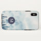 Misty Gebirgsbäume Aquarellbild mit marineblau-weißem Kreis Monogramm in der unteren Mitte.