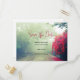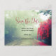 Save the Date Postkarte mit einem schönen Foto. Ein wunderschöner neblig Tag mit kurvenreichen Bahngleisen und schönem Laub und einem wunderschönen roten Baum. Ein sehr landschaftliches und launisches Bild.