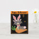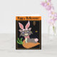 Misty ist eine graue Cartoon-Katze in einem zauberhaften, rosa, sonnigen Kostüm, komplett mit Kaninchenohren und Schwanz. Sie sitzt auf einem Karottenkissen, das vor einem dunklen Spuk Haus mit ein paar Lichtern aufgestellt ist, und eine braune Eule ist darauf gekrönt. Trick oder Treat! Der Hintergrund kann eine beliebige Farbe haben.