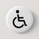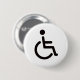 Knöpfen Sie die Aufmachung eines weißen und schwarzen mit Behinderung Zeichen- oder Handikapsymbols, das einen schwarzen behinderten Mann kennzeichnet, der sich in einem Rollstuhl auf einem weißen Hintergrund hinsitzt. Dieses Symbol wird für Handikapparken, Toiletten für die mit Behinderung und behinderten Personen und mehr verwendet. Auch verfügbar in anderen Farben.
