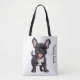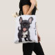 Eine reizende Tasche, die den Inbegriff von Cutness in Form eines hübschen, im Stil eines Cartoon gehaltenen, schwarzen Bulldoggen Welpen mit weißem Fleck präsentiert. Die Leinwand der Tasche ist sauber und neutral und bietet den idealen Hintergrund, um die Eigenschaften des Welpen zu einem Pop zu machen. Im Mittelpunkt des Designs steht ein fröhlicher, schwarzer französischer Bulldog Welpe, der die Show mit seinem herzlichen Lächeln stiehlt. Ihre Augen sind hell und ausdrucksstark, strahlen ein Gefühl von Verspieltheit und Unschuld aus. Das weiche, samtige Fell des Welpen ist vorwiegend schwarz und bildet einen auffallenden Kontrast zum strahlenden weißen Fleck auf seiner Brust. Dieser Patch verleiht dem Welpe seine einzigartige Identität und trägt zu seinem liebenswerten Aussehen bei. Das ausdrucksstarke Gesicht des Welpen wird von den runden, perkeln Ohren umrahmt, und seine winzige, knopfähnliche Nase liegt direkt über seinem breiten, freundlichen Grinsen. Der Mund des Welpen zieht sich nach oben und bildet ein bezauberndes Lächeln, dem man nur schwer widerstehen kann. Die Pfoten sind höflich dargestellt und verleihen der Gesamtdarstellung eine zusätzliche Touch Charme.