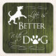 Schützen Sie Ihre Tisch und Zähler mit Life ist besser mit einem Hundepapier-Untersetzer. Im Untersetzer-Design steht ein Text, der besagt: "Das Leben ist besser mit einem Hund..." mit einem Pfotendruck und einer Silhouette mit Hund vor einem tiefgrünen rustikalen Holzhintergrund. Auch zusätzliche Geschenkartikel sind in diesem Design erhältlich.