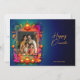 Die Karte "Radiant Diwali Wishings" ist mit reichhaltigen, festlichen Elementen geschmückt. Der Hintergrund ist ein Gefälle tiefblauer Übergänge in eine hellere Farbe, bestreut mit kleinen leuchtenden Punkten, die Sterne oder Lichter ähneln, und erhöht die feierliche Stimmung. In der Umgebung des Rahmens für das individuelle Foto erwecken lebendige Blumenmotive in leuchtenden Rosa, Orangen und Püree das Design zum Leben. Die goldfarbenen und orangefarbenen Öllampen (Deuen) sind hervorgehoben über, unter und neben dem Rahmen platziert und symbolisieren die traditionelle Beleuchtung der Lampen während Diwali. Diese Elemente schaffen ein warmes und einladendes Glühen und tragen zum festlichen Charme der Karte bei. Auf der rechten Seite wird die Nachricht "Happy Diwali" in einem eleganten gelben Schrift geschrieben, ergänzt durch den anpassbaren Text "from [your name] Family" in einem gepflegten, kleineren Schriftart unten. Die Rückseite der Karte weist einen soliden dunkelblauen Hintergrund auf, der dem Farbschema der Vorderseite entspricht. Der anpassbare Text auf der Rückseite ist in einem weißen Schriftart geschrieben und bietet einen klaren Kontrast, der eine einfache Lesbarkeit gewährleistet. Dieses Design verkörpert die Wärme und Freude der Diwali Feiern mit leuchtenden Lampen und farbenfrohen Blumenakzenten.