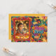 Die Happy Diwali Grußkarte besticht durch einen lebendigen und verzierten Rahmen, umgeben von bunten Blumenmustern. Der Hintergrund ist ein reichhaltiges aquamarines Grün, das sich wunderbar mit den warmen Farbtönen der Blume kontrastiert. Die Blume sind in Orange-, Gelb-, Rot- und lila-Tönen gehalten und sorgen für ein lebendiges und festliches Ambiente. Die aufwändige Detailgestaltung umfasst wirbelnde Weinreben und Blütenblätter, die die Eleganz des Designs noch verstärken. Der leere Raum in der Mitte ist durch eine goldene Grenze mit roten Akzenten gerahmt, die für ein individuelles Bild bestimmt ist. Der gesamte Stil wird durch traditionelle indische Designs inspiriert und eignet sich perfekt für einen festlichen Anlass wie Diwali.