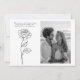 Hochzeitsbriefsammlung "Timeless Bloom": Diese horizontal ausgerichtete Hochzeitseinladung strahlt Eleganz und Gleichgewicht aus. Auf der Vorderseite wird das Single-line-Rose-Kunstwerk anmutig auf der links Seite platziert und bildet mit seinen zarten, durchgehenden Linien den Mittelpunkt des Designs. Auf der rechten Seite werden die Einladungsdetails in einem strukturierten Format dargestellt. Die Namen der Braut und des Bräutigams erscheinen oben in einem fließenden, eleganten Drehbuch, gefolgt vom Hochzeitstag in einem klassischen Serif-Schriftart. Darunter sind die Einzelheiten der Hochzeit, wie der Ort und die Zeit der Zeremonie, klar definiert, um Klarheit und Raffinesse zu gewährleisten. Auf der Rückseite der Einladung wird das Thema mit dem auf der links Seite gespiegelten Rose-Kunstwerk fortgesetzt, wobei die visuelle Konsistenz gewahrt bleibt. An der Spitze steht eine anpassbare Zeile für alle zusätzlichen Informationen zur Verfügung, wie z.B. eine Website-Adresse oder eine persönliche Nachricht an Gäste. Auf der rechten Seite befindet sich ein großes, schönes Foto des Ehepaares, das eine persönliche und herzliche Touch verleiht. Das Foto fügt nicht nur Wärme hinzu, sondern spiegelt auch die einzigartige Geschichte des Ehepaares in der raffinierten Ästhetik der "Timeless Bloom"-Kollektion wider. Das gesamte Design vereint die künstlerische Eleganz des Rose-Motivs nahtlos mit praktischen Elementen und schafft so eine anspruchsvolle, zusammenhängende Einladung, die zeitlos ist wie die Liebe, die es feiert.