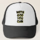 Dieser LKW hat die Worte "Mit Gott kannst du" in einem Bubble-Druck, mit schwarzen Buchstaben und gelben Schatten-Kontur mit einem typographischen Stil in diesem religiösen Thema. Dieser Hut ist komfortabel, lässig und von 17 bis 24" einstellbar mit 100% Nylonschaumfront und Nylonmesh Rückenlehne, ideal für den Alltag oder jeden besondere Anlass.