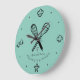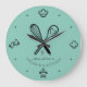 Die moderne Bäckereiuhr bietet eine Auswahl an handgezeichnet Backgrafiken (Kuchen, Koch-Hut, Ofen-Mitte, Lebkuchen, die die 12, 3, 6 und 9 Uhr darstellen. Ein stilisierter Whisk und Löffel überqueren sich in der Mitte der Uhr. Die Worte "Made with Liebe" sind in einem modernen handgeschriebenen Schriftart geschrieben. Anpassen mit dem Namen. Aquamariner blauer Hintergrund und schwarze Elemente schaffen ein modernes Aussehen. Sie können die Hintergrundfarbe, die Logo-Farbe, den Schriftart und das Layout nach Ihren persönlichen Vorlieben anpassen. Ideal für die Zuhause-Bäckerei!