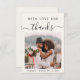Elegante helle Hochzeit Dankeschön-Karte mit Ihrem Hochzeitstag Foto, "Mit Liebe und Dank" in einer Mischung aus einfachen modernen Typografie und einem schicken Skript mit Swashes und Ihre Vornamen und Hochzeitsdatum verbunden mit einem Herz. Auf der Rückseite personalisieren Sie Ihre Danksagung und fügen Sie Ihre Namen in ein signaturähnliches Skript.