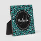 Cooles niedlich-schicke, aquamarin-blaue, schwarz-weiße leopardenfarbene Druckpunktmuster mit schwarzer Typenschild für Ihren individuellen Anfangsbuchstaben und Namen in Monogramm. Chic Vektor Hintergrund Design mit einer bunten Tierhaut. Großartiges Geschenk für Mädchen, die abstrakte geometrische Muster und mit Monogramm Geschenke Liebe