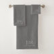 Dieses elegante Handtuchhandtuch-Set mit elegantem und elegantem Ambiente und einem ultramodernen Minimalisten in einem etwas hellgrauen Monogramm steht den dunkelgrauen Handtüchern gegenüber. Die Einrichtung ist elegant und schlicht. Dieses Handtuch-Set umfasst Badehandtücher, Handtücher und Waschlappen, die alle im gleichen Design und in einem einheitlichen Stil gehalten sind. Jedes Handtuch ist mit einem subtilen, hellgrauen Monogramm versehen, das in einem schicken Schriftart mit klaren, knusprigen Linien gefertigt wird. Das Monogramm befindet sich diskret an einer Ecke des Handtuches, wodurch eine persönliche Touch gewährleistet wird, ohne die minimalistische Ästhetik zu überfordern.