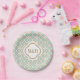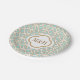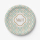 Entwirft elegante, stilvolle und schöne französische marokkanische Fliese inspirierter PapierTeller mit einem wiederholenden Blau und Goldder eierschale grünliches geometrischen quatrefoil Muster. Unser kundenspezifischer PapierTeller des upscale und luxe Blickes kann mit den Initialen der Braut und des Bräutigams oder des Feierns mit Monogramm sein Paare und ist für einen formalen Marokkaner, eine Inder-inspirierte, arabische Nacht- oder Aladdinthemed Hochzeit, eine Paardusche, ein Brautparty, ein Jahrestags-Party oder eine Verlobungsfeier perfekt. Entwurf © Chrissy H. Studios, LLC. Alle Rechte vorbehalten