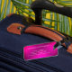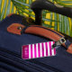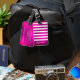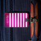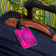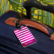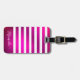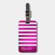 Mit einem fuchsienrosa und weiß gestalteten Gepäckanhänger. Mit Template Text können Sie Ihren Namen, Ihre Adresse, Ihr Telefon und andere Kontaktinformationen ganz einfach eingeben. Die Rückseite ist lila mit weißem Text, die Streifen sind nur auf der Vorderseite.