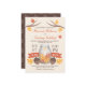 Eine wunderschöne Herbsthochzeit mit einem Eichenbaum-Ast und einem goldgelben und orangefarbenen Herbstblatt-Design mit einem orangefarbenen Banner mit weißem Herzen, der das Heiratsjahr umrahmt, und einem Maurerkirsch mit einer beleuchteten Kerze und herbstlichen Blätter am Ende des Glases. Acorne flankieren auf jeder Seite des Glasgefäßes und können mit dem Initial und Monogramm der Braut und Bräutigam mit Monogramm werden. Die Rückseite der Einladung ist dunkelbraun mit einem Eichenblattmuster. Artwork © Chrissy H. Studios, LLC. Alle Rechte vorbehalten.