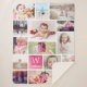 Sherpa Decke, wo Sie Ihre eigenen Fotos hinzufügen können. Fügen Sie fünfzehn Ihrer Lieblings-Fotos zu dieser Decke in einer modernen Collage. Fügen Sie Ihren Anfangs- und Familiennamen zu einem heißen rosa Aquarellhintergrund hinzu. Die Foto sind durch klare, weiße Linien getrennt.