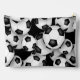 Dieser Reißverschluss-Beutel zum Thema Fußball zeichnet sich durch ein zufälliges Muster von unterschiedlich großen Fußballbällen aus, die auf einem schwarzen Hintergrund gedreht wurden - mit dem Mongramm des Fußballspielers - von katz_d_zynes