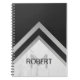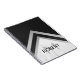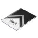 Dieses moderne Notizbuch zeichnet sich durch ein geometrisches Design aus, mit einem anpassbaren Namen und Monogramm in weißem Marmor und Silberrahmen auf schwarzem Hintergrund.