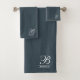 Ein stilvolles, modernes mit Monogramm Handtuchhandtuch-Set aus Holzkohle, mit weißem Schriftzeichen-Initial und Serifennachname. Eine vollkommene Akzent-Farbe für ein erdneutrales Wellness-Center-Bad.
