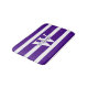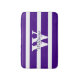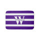 Stilvolle Badematte, in einem lila, kräftig gestreiften Muster gefertigt. Ein individuelles großes, weißes Monogramm mit einem Buchstaben, mitten in der Matte, und lila Text, ist bereit, für sich selbst oder als eine großartige Geschenkidee zu personalisieren. Es gibt drei Größen.