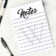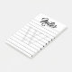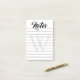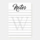 Lined Post-its mit Notizen an der Spitze in einem fett kalligraphischen Skript geschrieben. Unter den Zeilen ein hellgraues Monogramm.