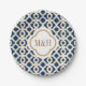 Elegante, stilvolle und wunderschöne französische Fliesen inspirierte Papier-Teller mit einer sich wiederholenden Marineblau und goldfarbenen geometrischen Quatrefoliendesign. Unsere hochwertigen und luxuriösen Teller können mit den Initialen der Braut und des Bräutigams mit Monogramm werden und eignen sich hervorragend für eine feierliche Hochzeit mit marokkanischer, indischer, arabischer oder Aladdin, Paardusche, Brautparty, Jubiläumsfeier oder Verlobung. Design © Chrissy H. Studios, LLC. Alle Rechte vorbehalten