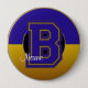 Mit Monogramm Knopf für Schulfarben, Blau und Gold, Letter B- Ein großer, rund 4 Zoll Button gedeckter Knopf mit einem gesteppten Monogramm-Buchstaben in der Mitte. Der Hintergrund dieses Knopfes wird in zwei Schulfarben (blau und gold) mit einem mittleren Loch-Ausschnitt erstellt, der einen schwarzen Hintergrund darunter zeigt. Der runde Rahmen wird in der Mitte und an den Außenkanten mit einem schönen goldenen Rand ausgetrimmt. In der Mitte befindet sich ein großer Alphabet Buchstaben, der in Goldnähe geschnitten ist. Es gibt bereits einen Textbereich, in dem Sie nach Belieben personalisieren können. Sie können einen Vornamen, Nachnamen, einen Schulnamen oder alles andere schreiben, was Ihnen gefällt. Sie können auch den Textbereich löschen, wenn Sie es vorziehen. Personalisieren Sie diese Schaltfläche Schulfarben auf Anzug. Diese Monografie-Schaltfläche des Kollegiums ist in verschiedenen Schulfarben erhältlich.