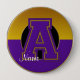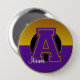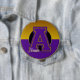 Mit Monogramm Taste, Lila & Gold, Letter A- Ein großer, rund 1,5 cm Button gedeckter Knopf mit einem gesteppten Monogramm-Buchstaben in der Mitte. Der Hintergrund dieses Knopfes wird in zwei Schulfarben (lila und gold) erstellt, wobei ein Mittellochausschnitt einen schwarzen Hintergrund darunter zeigt. Der runde Rahmen wird in der Mitte und an den Außenkanten mit einem schönen goldenen Rand ausgetrimmt. In der Mitte befindet sich ein großer Alphabet Buchstaben, der in Goldnähte ausgetrimmt wird. Es gibt bereits einen Textbereich, in dem Sie nach Belieben personalisieren können. Sie können einen Vornamen, Nachnamen, einen Schulnamen oder alles andere schreiben, was Ihnen gefällt. Sie können auch den Textbereich löschen, wenn Sie es vorziehen. Personalisieren Sie diese Schaltfläche Schulfarben auf Anzug. Die Schulfarbensammlung kommt in verschiedenen Farben.