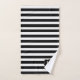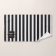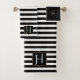 Modernes Set mit schwarz-weißem Badehandtuch mit einem waagerechten gestreiften Muster auf der Badewanne und Handtücher mit massivschwarzem Waschtuch. Eine schwarz-goldfarbene dekorative Plakette, hat ein individuelles weißes Monogramm mit einem Buchstaben. Personalisieren Sie den Brief, um Ihre Bedürfnisse zu Anzug. Eine passende Badezimmerdekoration ist vorhanden.