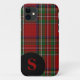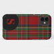 Schönes kariertes iPhone 11 Gehäuse im bunten, traditionellen schottischen Royal Stewart Tartan Muster. Eine schwarze Scheibe, in der unteren links Ecke, hat ein rotes Single Buchstaben Monogramm bereit für die Personalisierung.