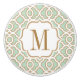 Fügen Sie Ihr Monogramm oder Initiale dem Klammer geformten Mittelentwurf auf einem tadellosen Grün und Goldquatrefoil Muster hinzu. Diese exotische und elegante marokkanische Art inspirierte Muster in der blassen en-grün Jade, weiß und goldish Braun ist für die Frau mit einer preppy, stilvollen und modernen Art perfekt. Grafik © Chrissy H. Studios, LLC. Alle Rechte vorbehalten.
