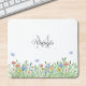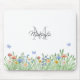 Dieses Blumenmousepad ist mit zarten Aquarellfarben-Blume, Blattwerk und Schmetterlingen in Pastellfarben dekoriert. Einfach anpassbar mit Ihrem Namen und Initial. Original Wasserfarbe © Michele Davies.