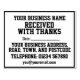 Erhalten mit Dank Rubber Briefmarke mit Name, Adresse, etc. Enthält Platz zum Schreiben eines Datums. Geben Sie Ihren Firmennamen, Ihre Adresse, Ihre Telefonnummer und Ihre E-Mail-Adresse ein.