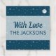 Modernes und personalisierbares blaues Geschenkschild mit weißen Schneeflocken. Die weiße Beschriftung lautet "Lass es schneien". Der Hintergrund ist mit Ihren Grüße und Namen anpassbar