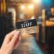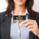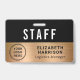 Modernes, berufliches Mitarbeiter-, Mitarbeiter- oder Crew-Identifizierungs-Abzeichen für Ihr Business, Ihre Veranstaltung, Ihre Tagung oder Ihr Kongress mit dem Logo Ihres Unternehmens oder Ihrer Organisation vor einem vergoldeten Imitat-Hintergrund. Fügen Sie einen Namen und einen Jobtitel oder das Ereignis und Datum hinzu.