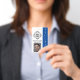 Dieses Abzeichen für einen Sicherheitsbeamten oder Mitarbeiter weist einen weißen Hintergrund mit einem Muster-Logo in der Mitte auf. Sie können das ID-Abzeichen personalisieren, um Ihr eigenes Unternehmens-, Geschäfts- oder Firmenlogo oder Ihr eigenes individuelles Image anzuzeigen. Unter dem Logo befindet sich ein Bereich zum Drucken eines Mitarbeiternamens oder eines anderen Textes. Das Wort "SICHERHEIT" wird rechts über einem blauen Banner gedruckt. Ein Beispiel-Foto wird in der unteren Hälfte gedruckt, die Sie ersetzen können, um Ihre eigene Foto-ID. Die Rückseite des Abzeichens hat einen blauen Hintergrund mit weißem Text, in dem Sie Ihre Firmennummer oder andere Informationen eingeben können.