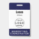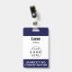 Personalisieren Sie dieses Abzeichen mit Ihrem Firmenlogo, Mitarbeiternamen oder anderen benutzerdefinierten Texten. Es ist aus Kunststoff pvc und mit einer Metallklammer, Lanyard oder einer einziehbaren Rolle erhältlich. Das Abzeichen ist mit marineblau-blauem Namen und modernem minimalistischem Design gestaltet. Sie können die Farben, Schriftart und das Design ganz einfach an Ihre Bedürfnisse anpassen und optional Inhalte auf der Rückseite hinzufügen. Keine Mindestbestellmenge und keine Einrichtungsgebühr.