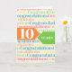 Dies ist eine farbenfrohe Mitarbeiter-Jubiläumskarte von 10 Jahren Herzlichen Glückwunsch. Im Hintergrund wird das Wort "Gratulationen" in rot, orange, gelb, grün und jade auf weißem Hintergrund geschrieben. Der Text '10 JAHRE' wird auf zwei zentral platzierten Schildern geschrieben, von denen einer orange und einer grün ist, mit einem Schlagschatten, um die Illusion der aus dem Hintergrund stehenden Etiketten zu geben. Ein buntes, aber einfaches und auffälliges Design. Natalie Kinnear Cards Diese Karte kann auch in meinem Online-Shop bei Greeting Card Universe erworben werden, die Druckpartner in den USA und Großbritannien hat: http://www.greetingcarduniverse.com/business/employee-relations/employee-anniversary/years-of-service-specific/employee-anniversary-10-years-1527938?gcu=47771017551