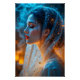 Ein traumhaftes, magisches Profilporträt einer ruhigen Frau mit leicht geschlossenen Augen und glänzenden roten Lippen. Sie wird durch duale Beleuchtung beleuchtet: von unten aufsteigende warme orangefarbene Strahlung und coole blaue Töne, die von oben absinken und ein dramatisches, aber friedliches Glühen über ihre Merkmale werfen. Über ihrem Kopf vergewaltigt ist ein schierer, leuchtend blauer Schleier, der das ätherische Licht strahlt und fängt. Die Atmosphäre ist lebendig mit winzigen goldenen und blauen Glitzern, die in der Luft schweben und mit zarten Rauchvorgängen verwoben sind. Hinter ihr glänzt ein sanfter Hintergrund mit orangefarbenen Membern, der dem mystischen Ambiente Wärme verleiht. Das Portrait ist sehr detailliert und fotorealistisch, mit einer Touch von fantastischem Charme.
