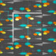 Moderne Bereiche und Dreiecke der Mitte des Jahrhunderts auf einem dunkelgrauen Hintergrund mit Bereichen in den Farben von hellem Blauem, von Orange und von Gelb.