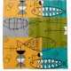 Mitte- des Jahrhundertsmoderne Duschvorhangfische Art. wunderlich und große Fische des Spaßes in der Orange, Avocado auf einem aquamarinen und grauen Hintergrund mit verschiedenen abstrakten Formen.