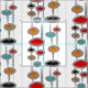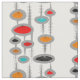 Flippiges Weltraumzeitalterovalgewebe mit Dreiecken. Farben von hellem Orange, rot, aquamarin und schwarz auf einem weißen Hintergrund. Mitte des Jahrhunderts inspirierter Gewebeentwurf. Alle Grafiken durch Gail Gabel, LLC.