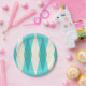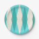 Dieser Mitte- des Jahrhundertsmoderne Rauten-Papier-Teller (großer Druck) kennzeichnet einen vibrierenden, Türkishintergrund und ein Muster des Mod, die lichtdurchlässigen aquamarinen Diamanten, welche die größeren bedecken, Vintagen Sahnediamanten mit dem gefärbten Gold, Raumalterstupfen. Dieser inspirierte Minimalist, deconstructed Raute ist ein stark vereinfachter Throwback vom größeren als Lebenatomära, die die verzierenlandschaft der Fünfzigerjahre und der Sechzigerjahre beherrschte. Dieser kitschy Entwurf ist von alles von retro Palm Spring' Bowlings-Gassenzeichen zu den Fernsehbehältern erinnernd, die Sie am Haus Ihrer Großmutter benutzten.